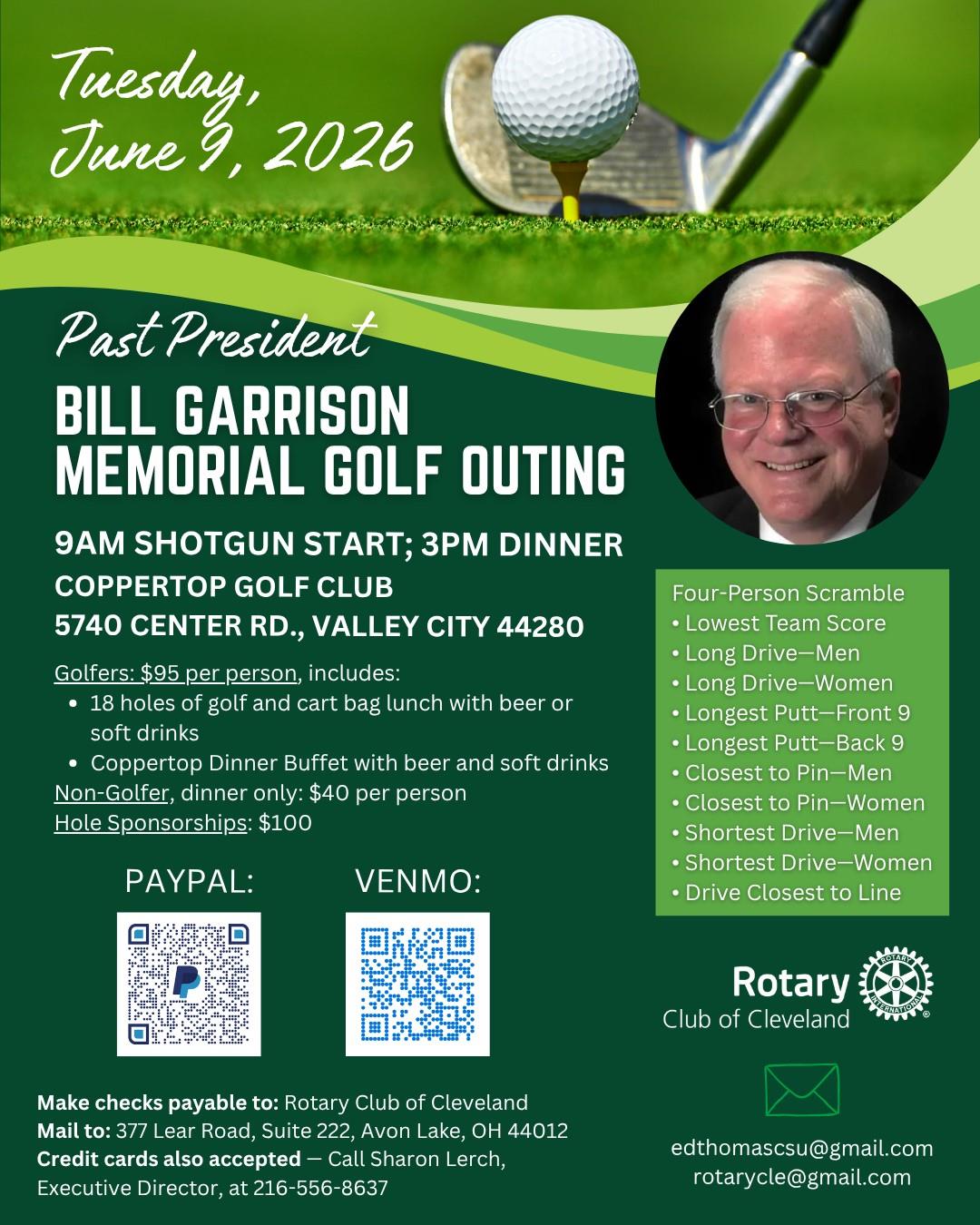 The Bill Garrison Memorial Golf Outing is being sponsored by the Rotary Club of Cleveland on Tuesday, June 9, 2026, at Coppertop Golf Course.