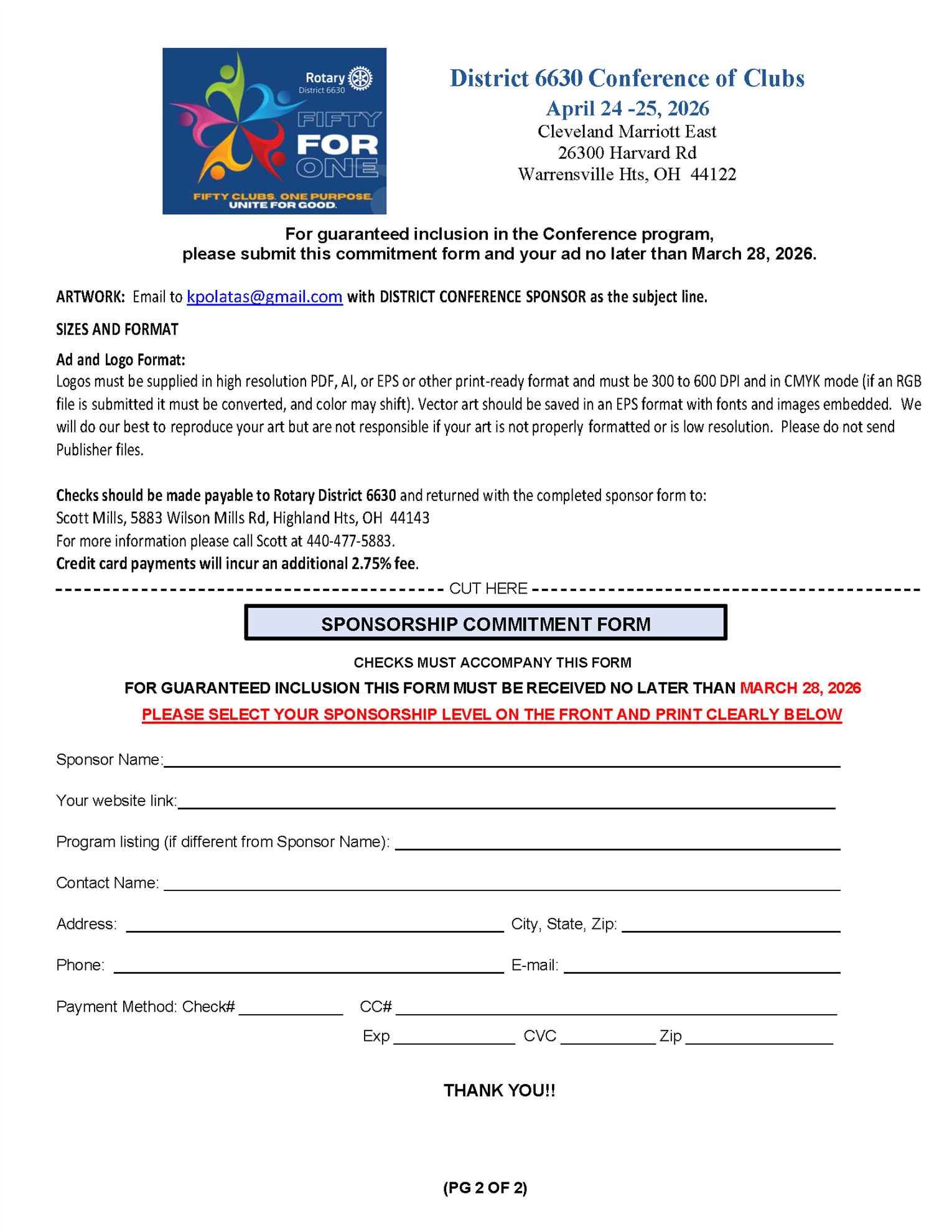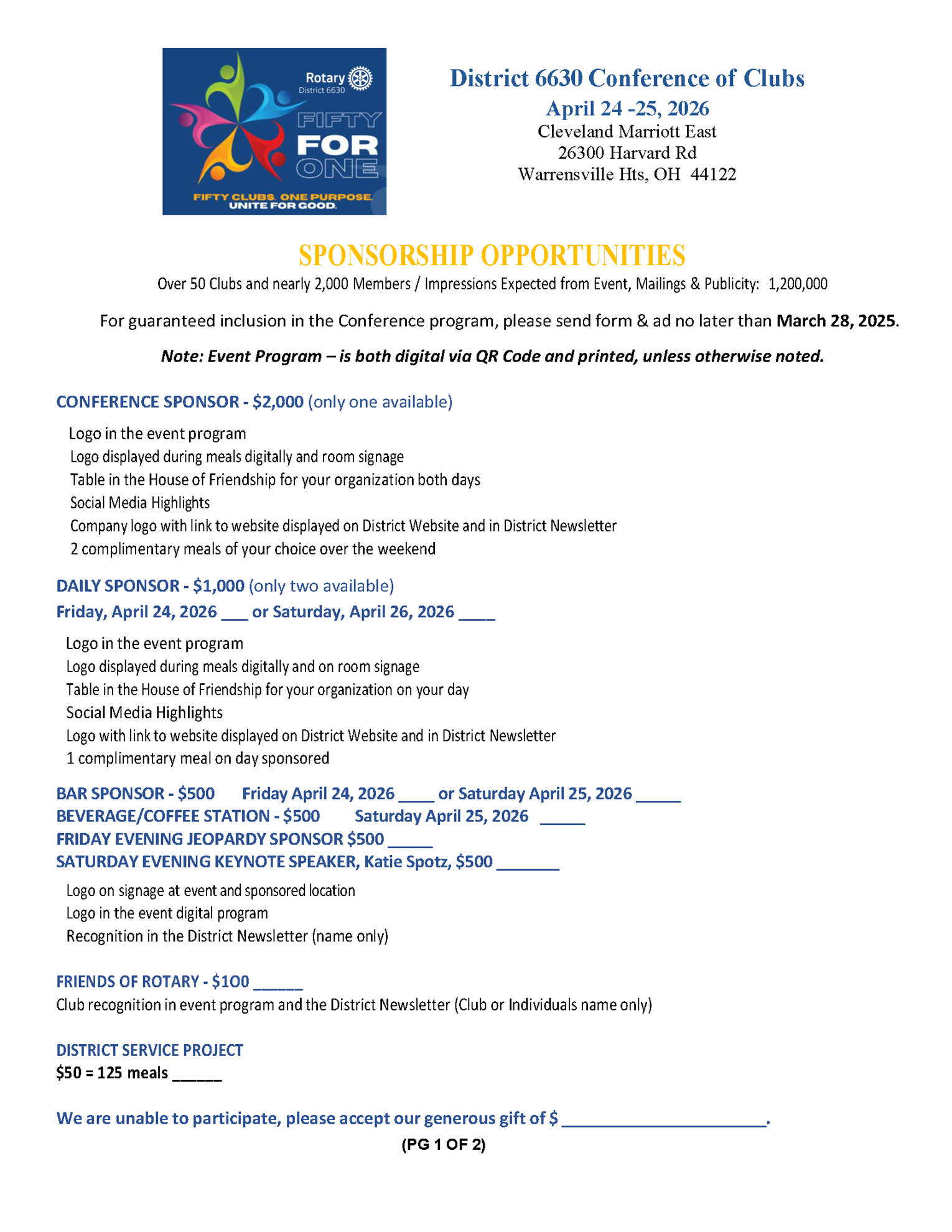 Our annual conference of clubs is coming up! It will be held on April 24-25, 2026, at Marriott Cleveland East in Warrensville Heights. This is the same location as last year. To better accommodate our working Rotarians, registration will not open until 2pm and the conference will begin with the business meeting followed by our Memorial service. Watch for a Save the Date email this week with more details, we will be announcing a very special keynote speaker for Saturday at our dinner. Stay tuned for details on Registration but block this time off now so you can attend.