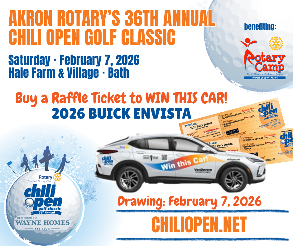Purchase tickets today at Chiliopen.net, or call Akron Rotary Camp at 330-644-4512. Tickets must be purchased by February 7th, 1pm to be included in the drawing.