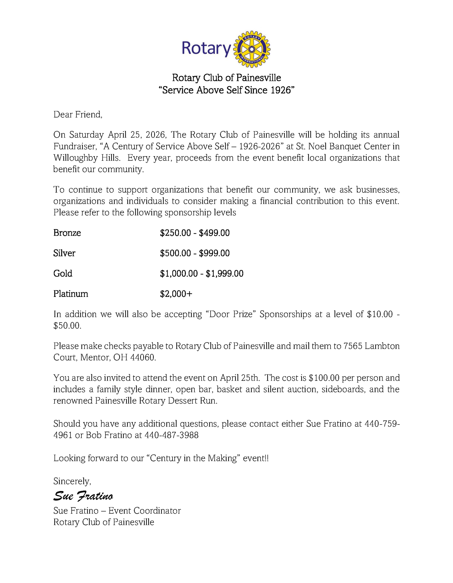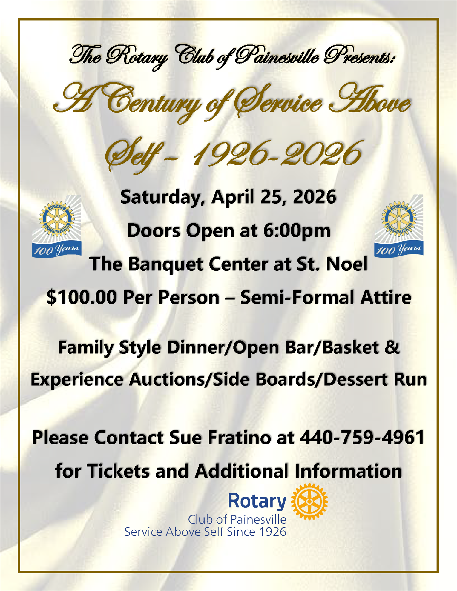 The Rotary Club of Painesville will celebrate its 100th anniversary on Saturday, April 25th, at The Banquet Center at St. Noel. Doors open at 6:00 pm. The celebration will include a family‑style dinner, open bar, basket and experience auctions, sideboards, a dessert run, and more. Semi‑formal attire is suggested. Tickets are $100 per person. Please contact Sue Fratino at 440‑759‑4961 for tickets or additional information. Join the fun with the Painesville Rotary members and their families. Great clubs do great things. Exceptional clubs do great things for over 100 years!